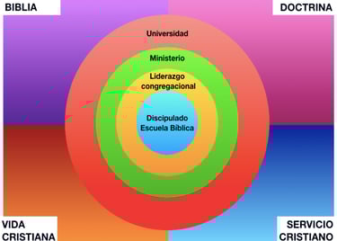 CONCÉNTRICO, porque avanza gradualmente de los niveles básicos de Discipulado, hasta los avanzados de nivel Instituto Bíblico, ampliándose en cada nivel propuesto y, simultáneamente, abarcando las cuatro áreas mencionadas anteriormente. Uno de los errores cometidos en el área de la formación de obreros cristianos, es no respetar el desarrollo gradual de adquisición de conocimientos. Esto significa que, en muchas ocasiones, el neófito es introducido en un avanzado nivel de formación bíblica, teológica y ministerial, sin haber adquirido los aprendizajes integrales previos. Esto causa daño a la formación integral del obrero.