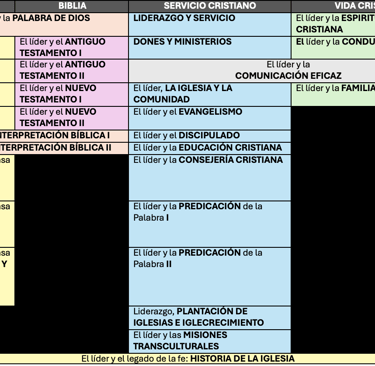 Consta de 28 módulos, distribuidos en 3 niveles, que abarcan las cuatro áreas fundamentales de conocimiento esencial para el liderazgo: doctrina, Biblia, servicio cristiano y vida cristiana.